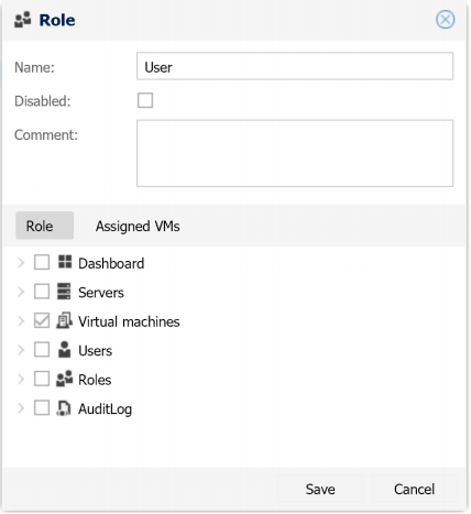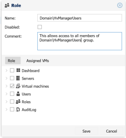 - To assign virtual machines to the Role select the Assigned VMs tab and click the plus button. Select virtual machines from the list (the Hyper-V server connection should be added before). To grant role users access to all VMs leave the Assigned VMs list empty.