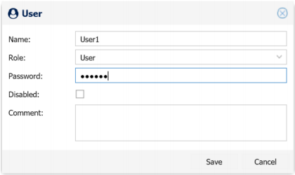 - Specify the User name, Role, and password. Then click Save to create the User.