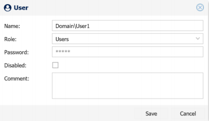 - Specify the AD or Windows User name and assign the Role. Then click Save to create the User
