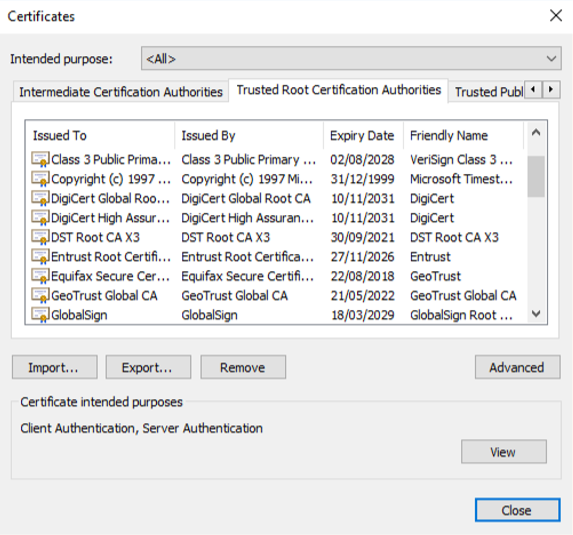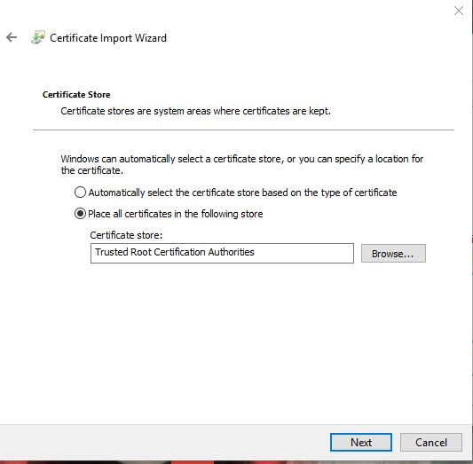 In the Trusted Root Certification Authorities tab, click Import to display the Certificate Import wizard.
