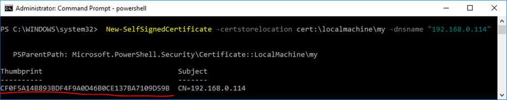 New-SelfSignedCertificate -certstorelocation cert:\localmachine\my -dnsname "192.168.0.114"