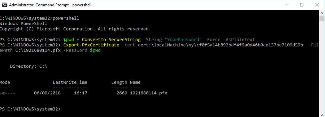 Export-PfxCertificate -cert cert:\localMachine\my\cf0f5a14b893bdf4f9a0d46b0ce137ba7109d59b -FilePath C:\1921680114.pfx -Password $pwd