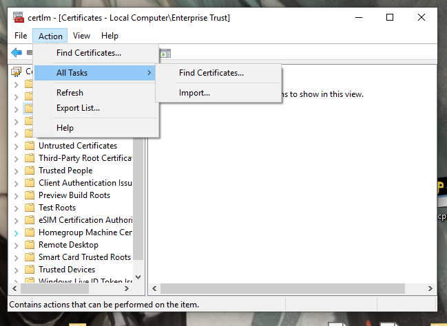 - Press “Action - All tasks - Import” buttons to import the certificate